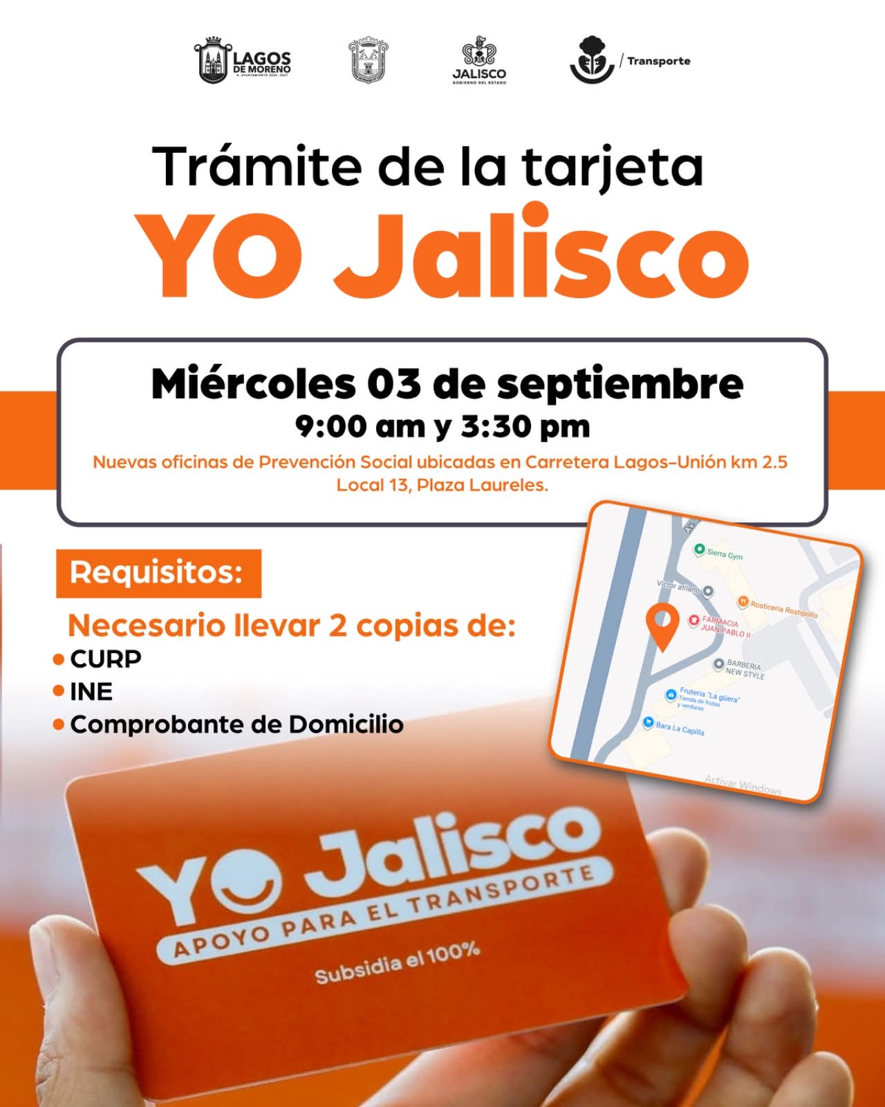 El Gobierno Municipal de Lagos de Moreno, en colaboración con el Gobierno del Estado de Jalisco, informa a la ciudadanía sobre la próxima jornada para el trámite gratuito de la tarjeta “YO Jalisco, Apoyo al Transporte”, dirigida a estudiantes y personas con discapacidad. Esta tarjeta brinda un subsidio en el costo del transporte público, como parte de una estrategia integral para garantizar una movilidad digna y funcional en el municipio.