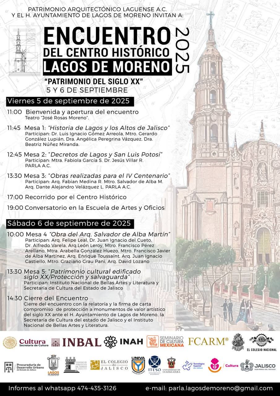 El Patrimonio Arquitectónico Laguense A.C. (PARLA), en colaboración con el H. Ayuntamiento de Lagos de Moreno, invita a la población en general a participar en el Encuentro del Centro Histórico Lagos de Moreno «Patrimonio del Siglo XX», que se llevará a cabo los días 5 y 6 de septiembre de 2025.