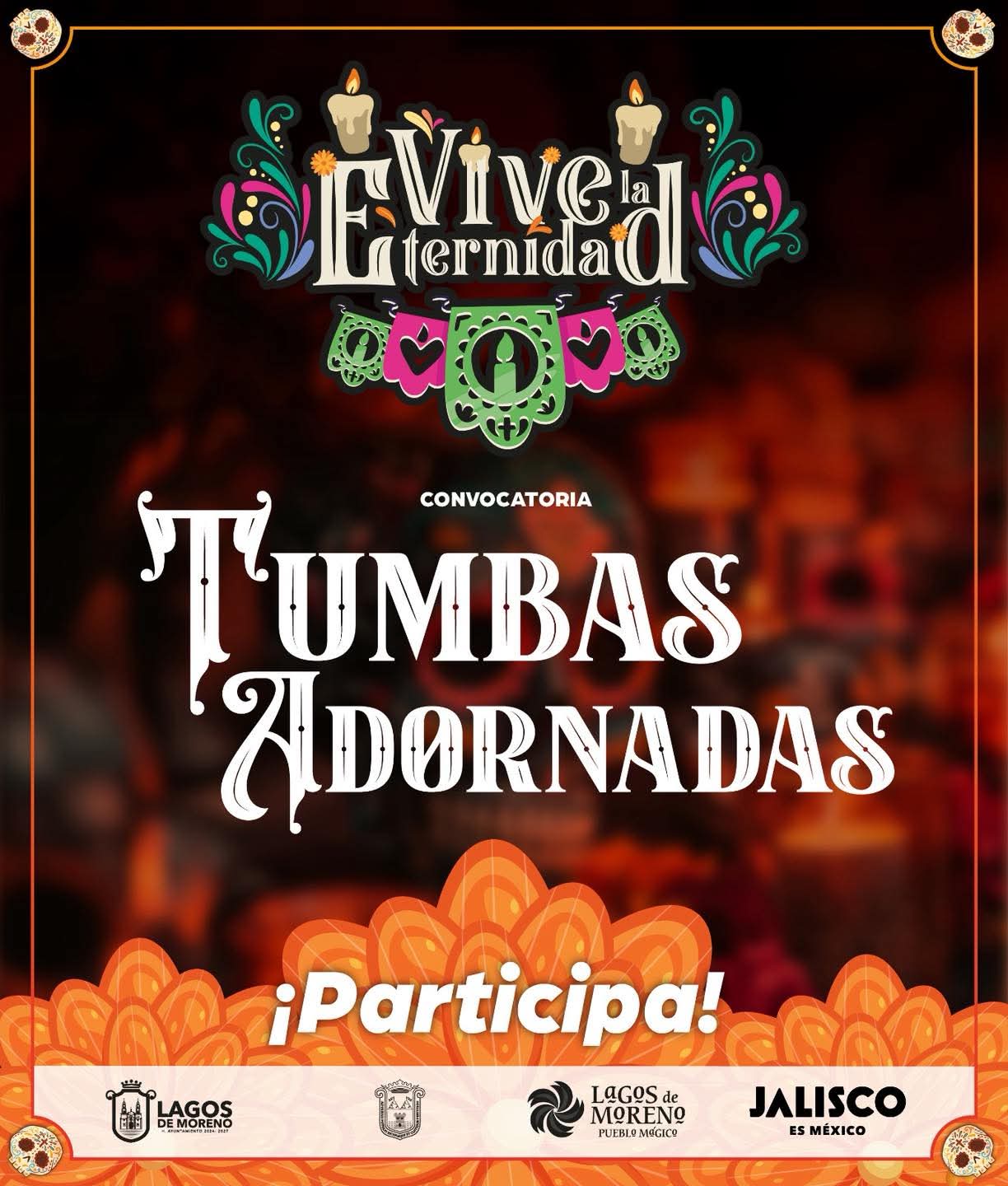 Con el propósito de preservar y fomentar nuestras tradiciones, así como rendir homenaje a nuestros difuntos, el Honorable Ayuntamiento de Lagos de Moreno, a través de la Dirección de Turismo y el Cementerio Municipal, convoca a todas las familias, instituciones educativas, asociaciones, grupos y al público en general a participar en el Concurso de Tumbas Adornadas 2025, que se llevará a cabo en el marco del Festival “Vive la Eternidad”.