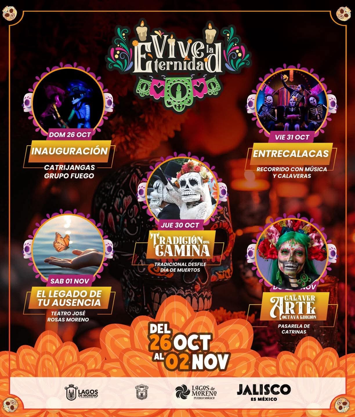 El Gobierno Municipal de Lagos de Moreno, encabezado por el Presidente Municipal, Mtro. Edgar González, invita a toda la ciudadanía a ser parte del Festival «Vive la Eternidad», como parte de las festividades de Día de Muertos, que se llevará a cabo del 26 de octubre al 2 de noviembre en distintos espacios emblemáticos de la ciudad.