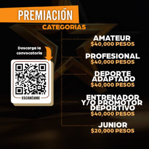 Este galardón contempla cinco categorías: Amateur, Profesional, Deporte Adaptado, Entrenador y/o Promotor Deportivo, y Junior, cada una con un estímulo económico como reconocimiento a su destacada trayectoria. Las categorías Amateur, Profesional, Deporte Adaptado y Entrenador y/o Promotor Deportivo recibirán un premio de $40,000 pesos; mientras que la categoría Junior obtendrá un premio de $20,000 pesos.